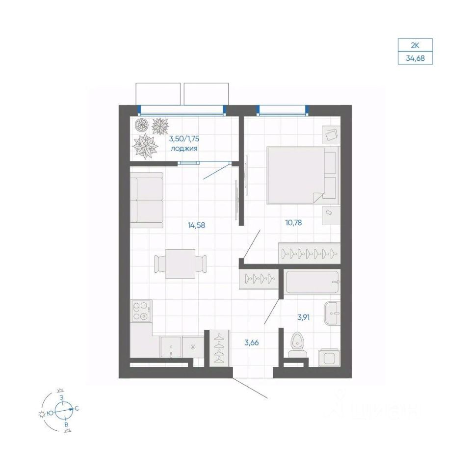 Общая площадь34,68 м²