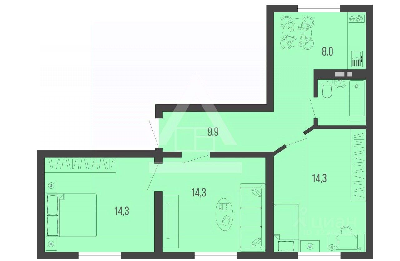 3 отдельные комнаты по 14.32кв.м, кухня 8 кв.м и совмещенный сан.узел