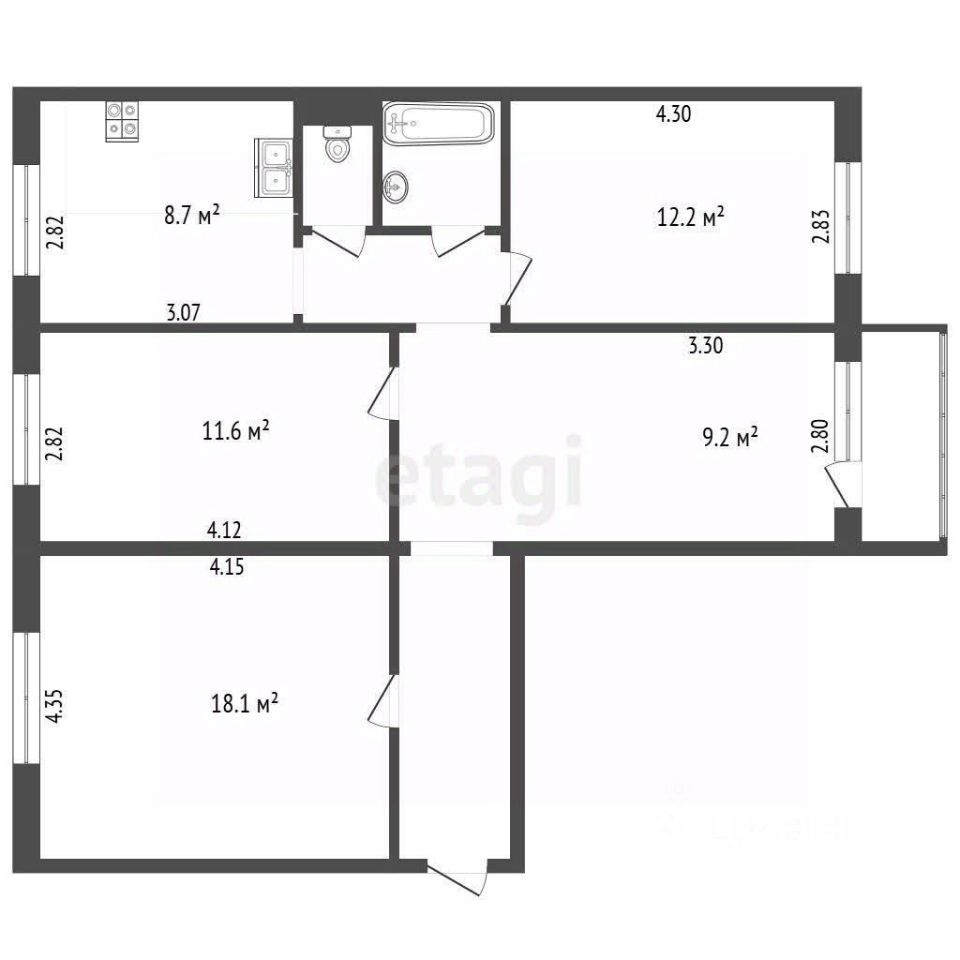* все 4 комнаты раздельные и правильной формы ( площадью:18,18,12,12 м2)
