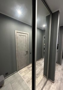 В прихожей у входа и на кухне так же положен керамогранит, на стенах моющаяся краска. В гардеробной установлены двери-купе и система хранения. На полу ламинат 34 класса.