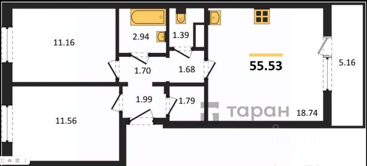 - Площадь - 53,3 м², удачная и востребованная планировка.