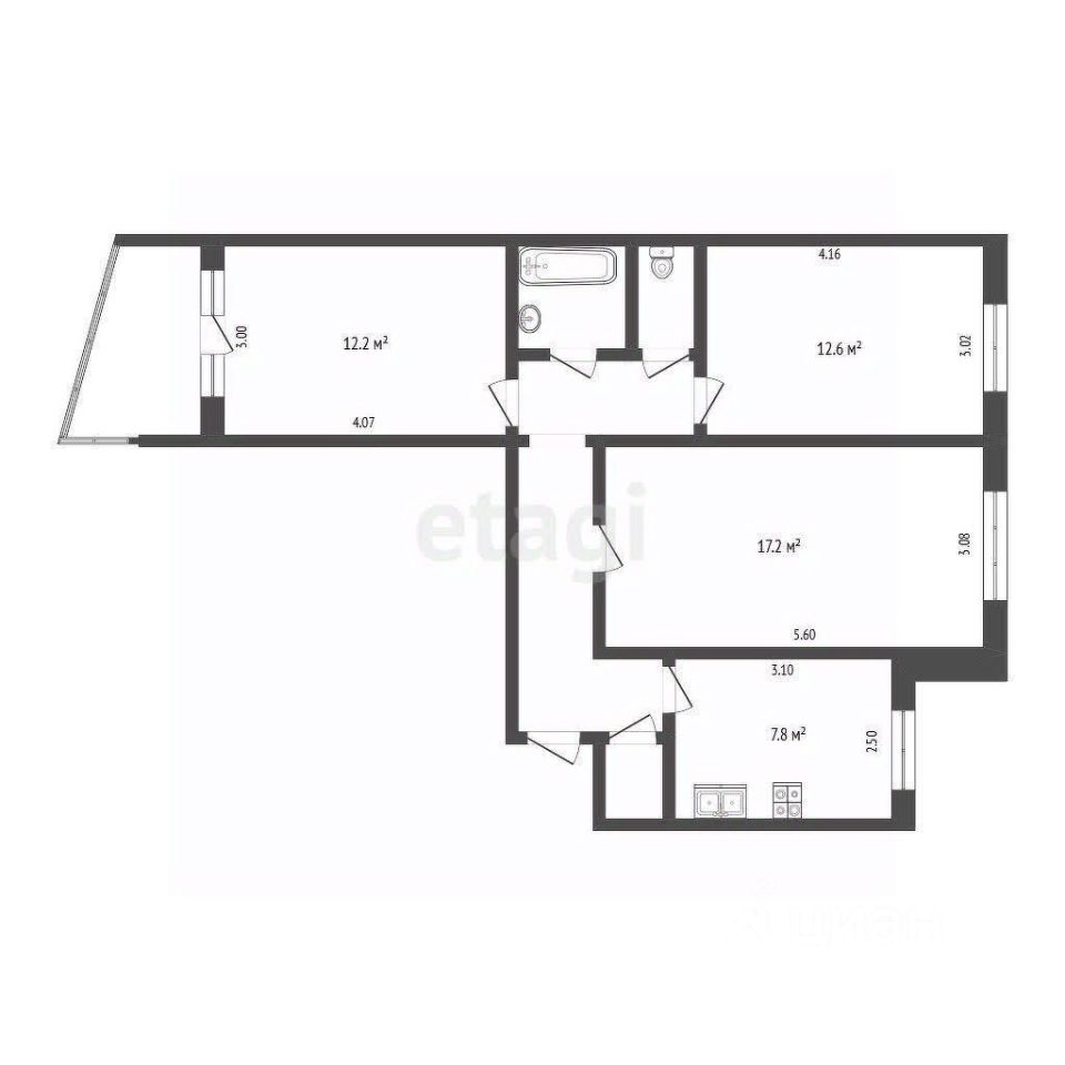Комнаты: 17,2 кв.м., 12,6 кв.м., 12,2 кв.м. с балконом, кухня 8 кв.м., санузел раздельный.