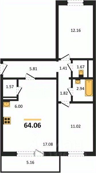 Арт. 126762928 Двухкомнатная квартира по привлекательной стоимости с удобной планировкой: кухня-гостиная 17.08 м2, раздельные санузлы, большой коридор, отдельная вместительная гардеробная. Большая лоджия, вид из окон во двор и на улицу.