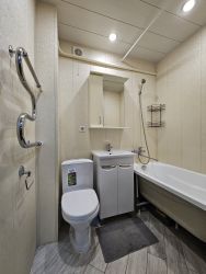 Санузел совмещенный, отделка стен выполнена пластиковыми панелями, пол выложен плиткой с электрическим теплым полом.