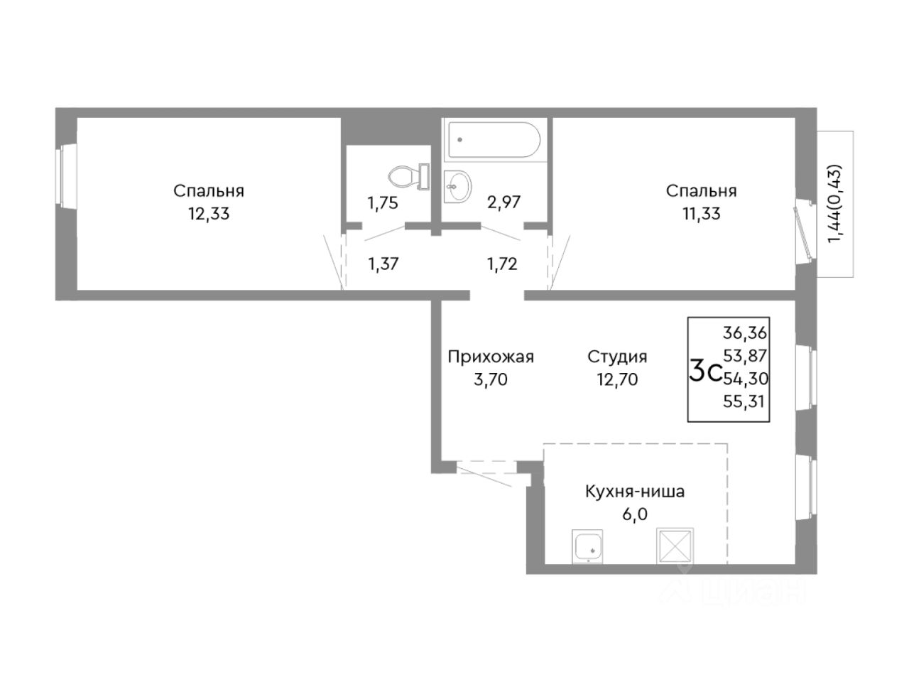 54,3 м²