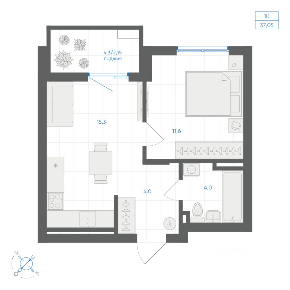 Общая площадь37,05 м²