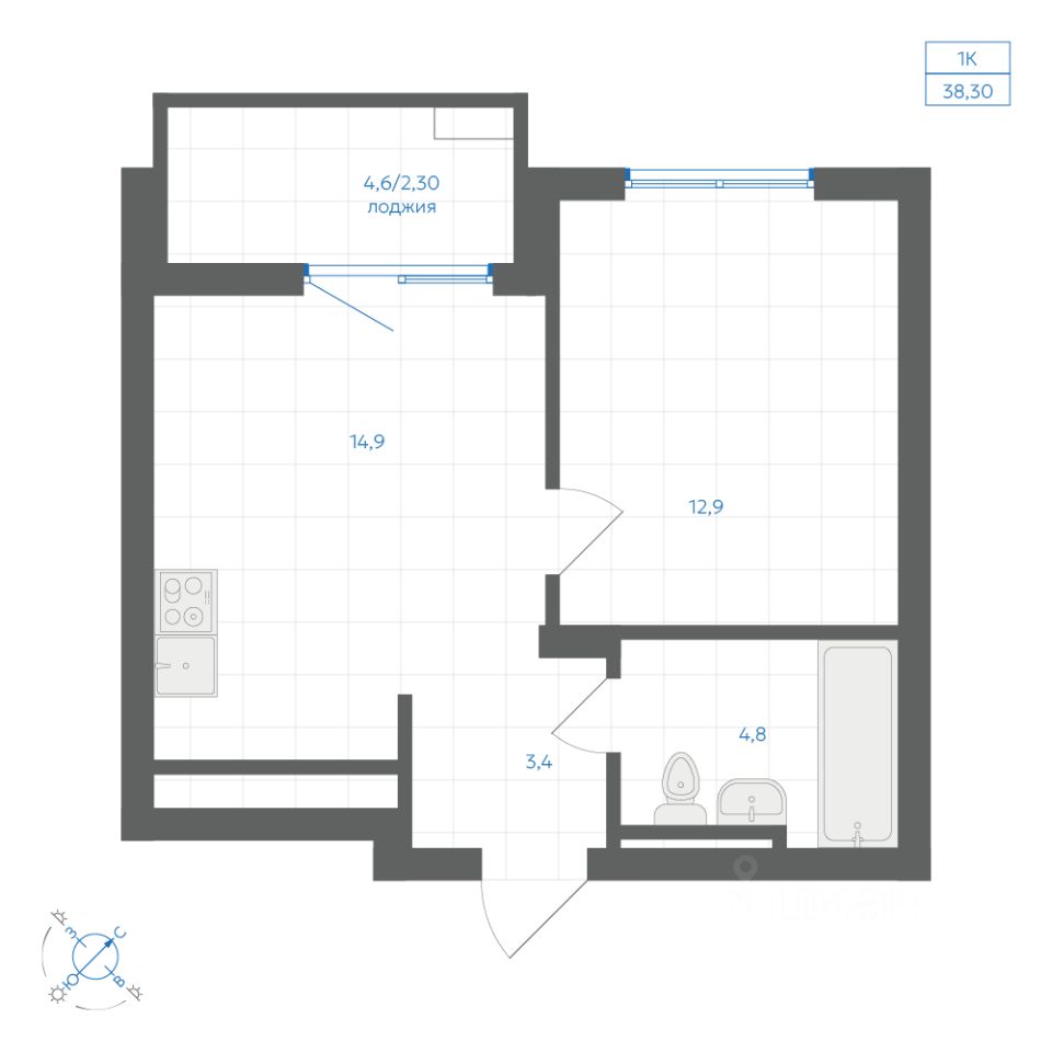 Общая площадь38,3 м²