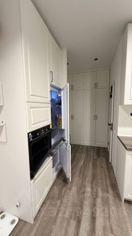 Установлен кондиционер. Мебель в едином стиле со встроенной техникой: посудомоечная машина, духовой шкаф, холодильник и морозильник, вытяжка и варочная поверхность на 4 конфорки.