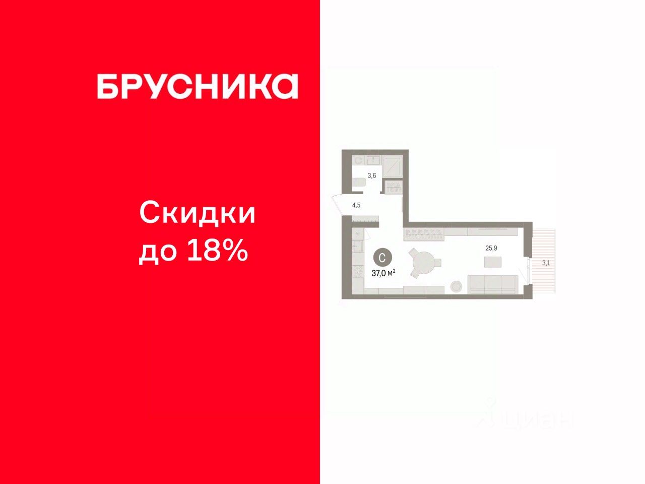 Однокомнатная студия с предчистовой отделкой в ЖК "Брусника в Эльтауне" на 4 этаже. Общая площадь: 37 кв.м., площадь гостиной 20.9 кв.м., из которых 5 кв.м. выделено под кухонную зону. Все окна выходят на одну сторону. В квартире один балкон, один совмещенный санузел. Высота потолков 2.7 м.