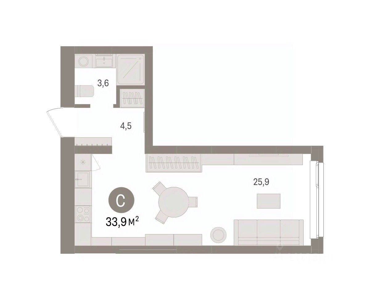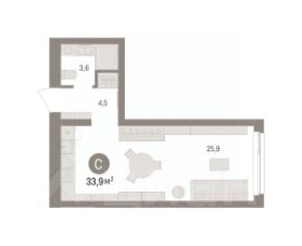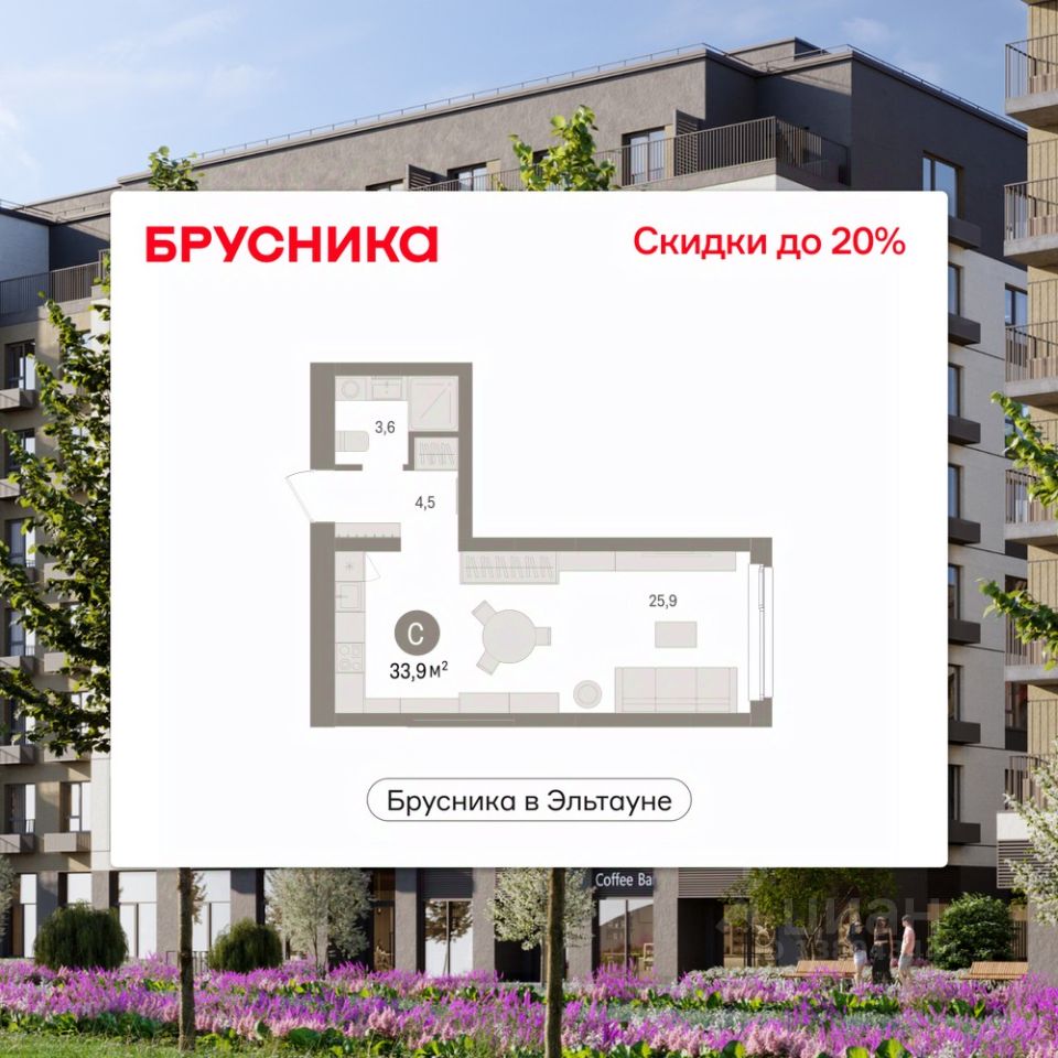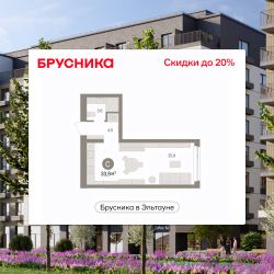 Продается однокомнатная студия от застройщика с предчистовой отделкой в ЖК "Брусника в Эльтауне" на 2 этаже. Общая площадь: 33.89 кв.м., площадь гостиной 25.9 кв.м., из которых 5 кв.м. выделено под кухонную зону. Все окна выходят на одну сторону. В квартире один совмещенный санузел. Высота потолков 2.7 м.