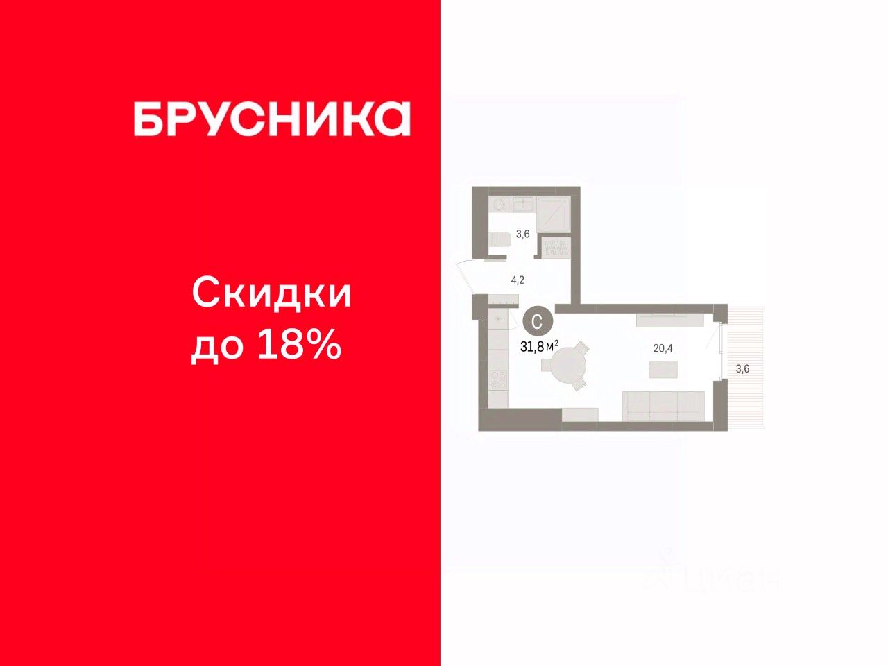 Просторная 1-комн. студия с предчистовой отделкой в ЖК "Брусника в Эльтауне" на 6 этаже. Общая площадь: 31.83 кв.м., площадь гостиной 20.4 кв.м., из которых 5 кв.м. выделено под кухонную зону. Все окна выходят на одну сторону. В квартире один балкон, один совмещенный санузел. Высота потолков 2.7 м.
