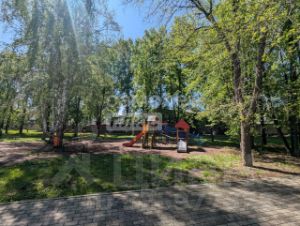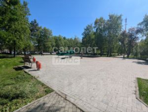 Большой сквер с детской площадкой; вокруг много зеленых насаждений.