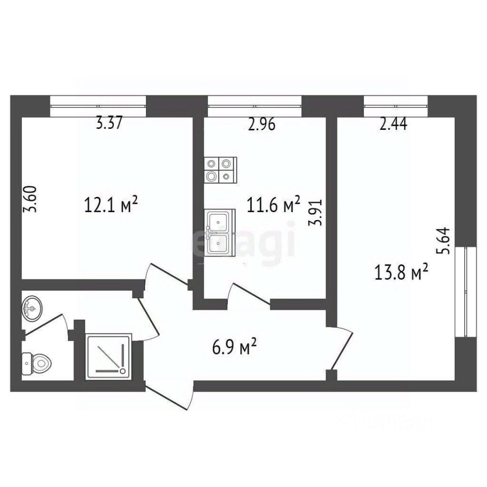 - Санузел общей площади, легко переоборудуется раздельным вариантом.