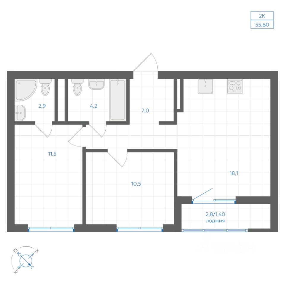 Общая площадь55,6 м²