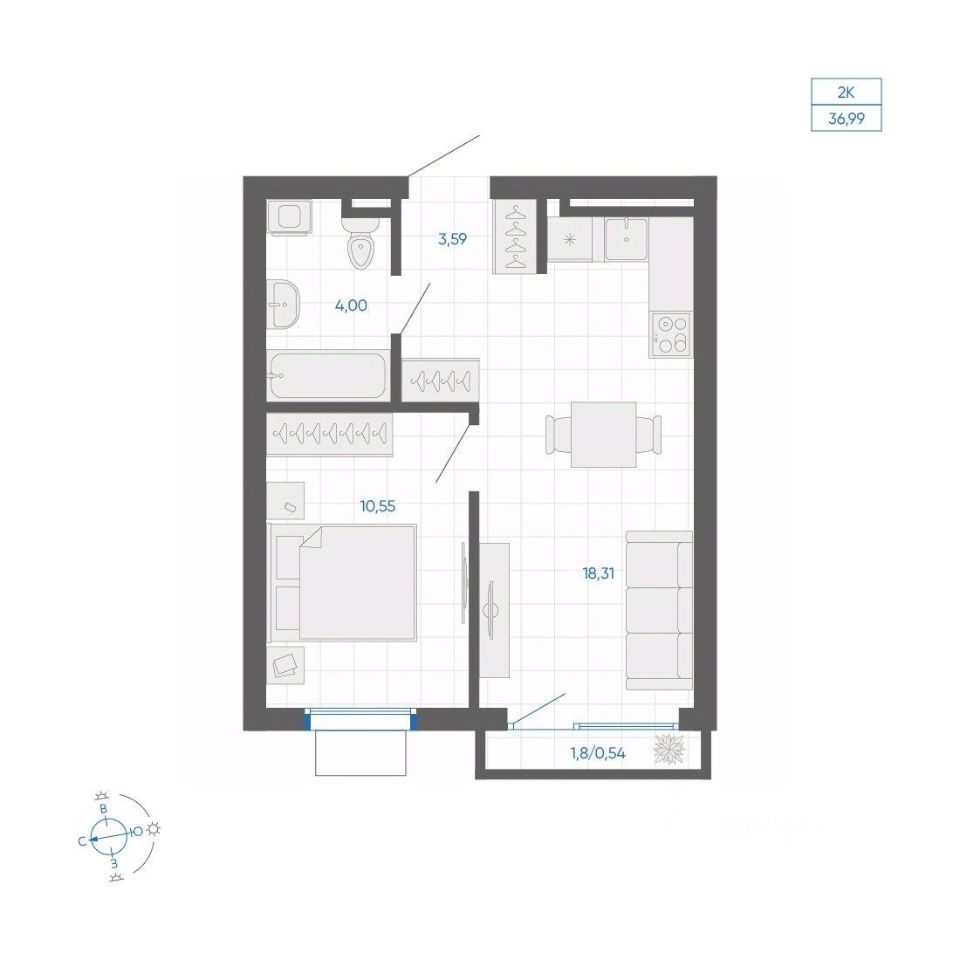 Общая площадь36,99 м²