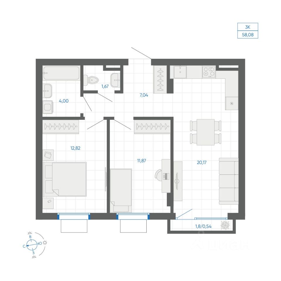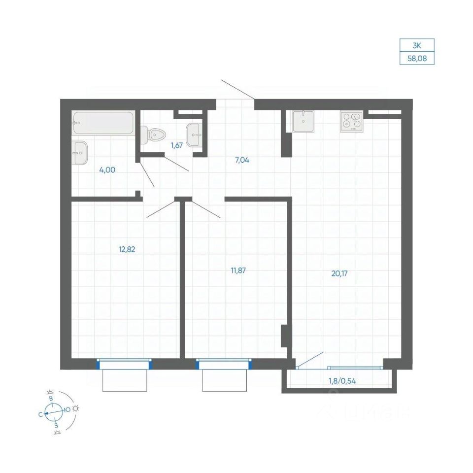 Общая площадь58,08 м²