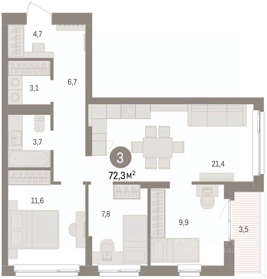 Квартира с кухней-гостиной и тремя спальнями в Бруснике в Эльтауне. Особенности планировки: вид во двор, лоджия, постирочная, разнесённые спальни.