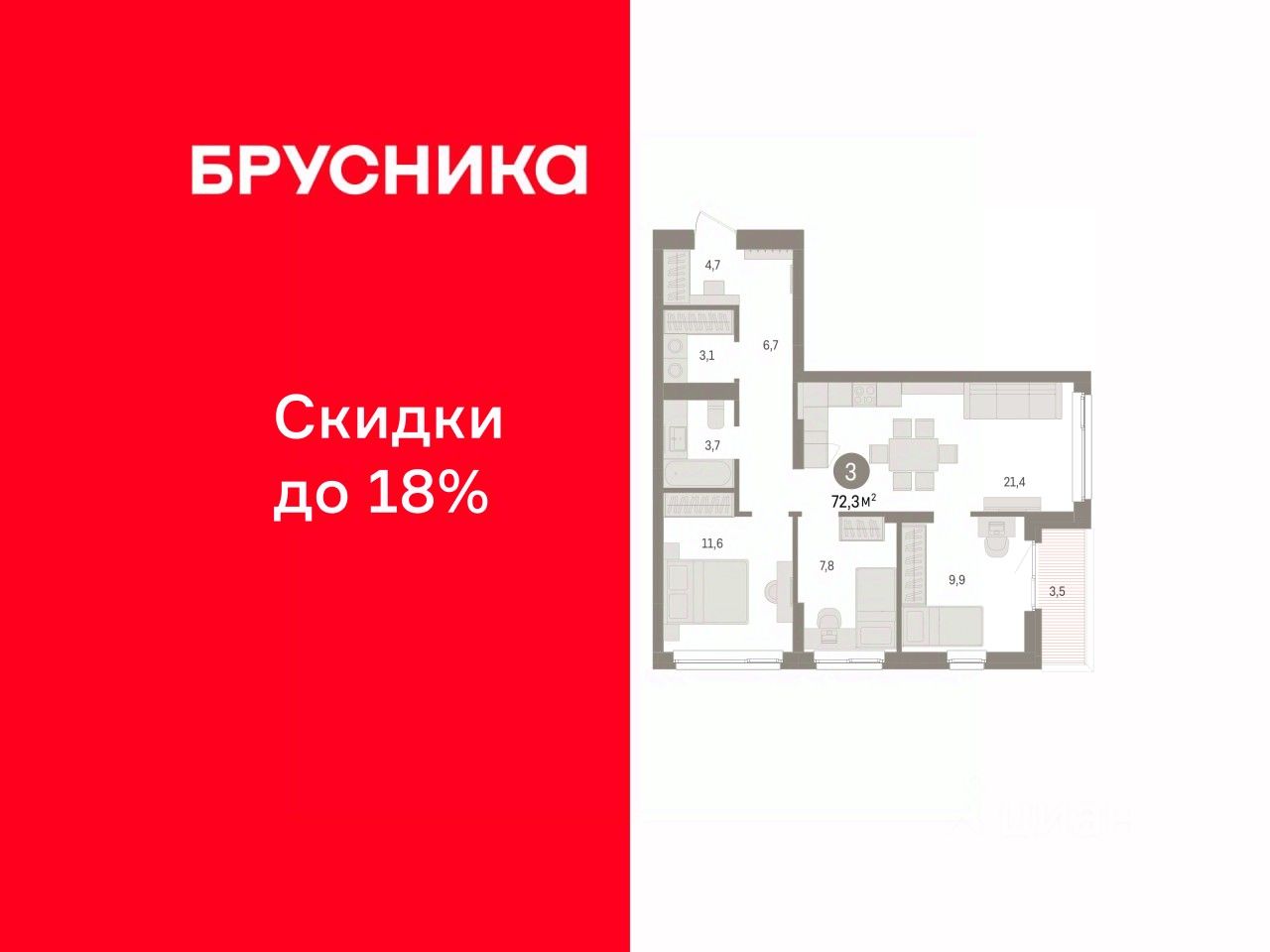 Трехкомнатная квартира от застройщика с предчистовой отделкой в ЖК "Брусника в Эльтауне" на 2 этаже. Общая площадь: 72.29 кв.м. Высота потолков 2.7 м.