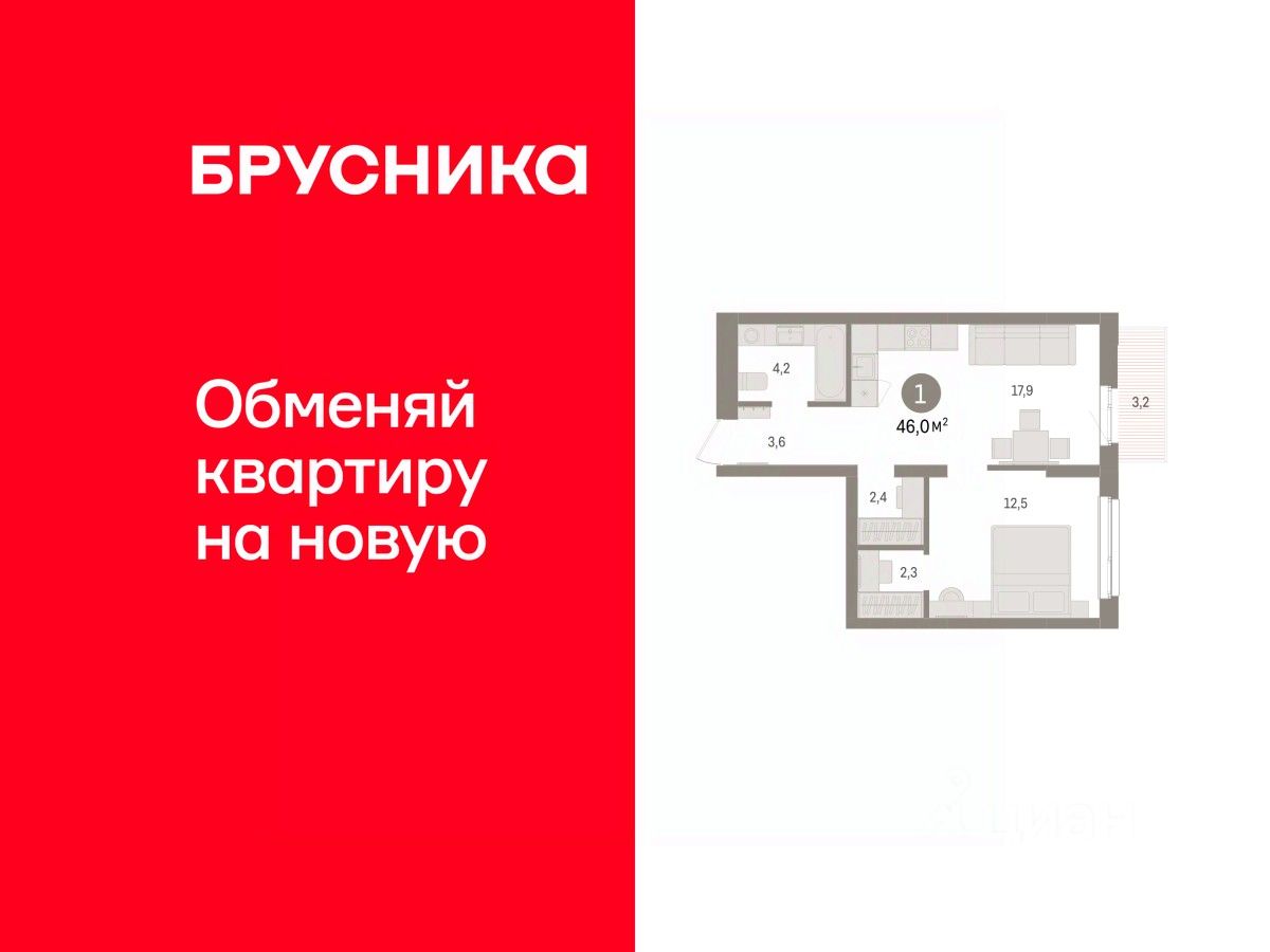 Однокомнатная квартира с предчистовой отделкой в ЖК "Брусника в Эльтауне" на 7 этаже. Общая площадь: 45.97 кв.м., жилая: 12.5 кв.м., площадь просторной кухни-гостиной: 17.9 кв.м. Все окна выходят на одну сторону. В квартире один балкон, один совмещенный санузел. Высота потолков 2.7 м.