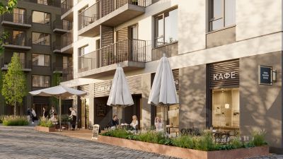 Территория Брусники разделена на несколько функциональных зон. Со стороны улицы Павленкова мы спроектировали фронт с коммерцией и приветственными площадями. На первых этажах домов — кафе, магазины, рестораны, кружки и образовательные студии.