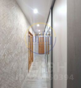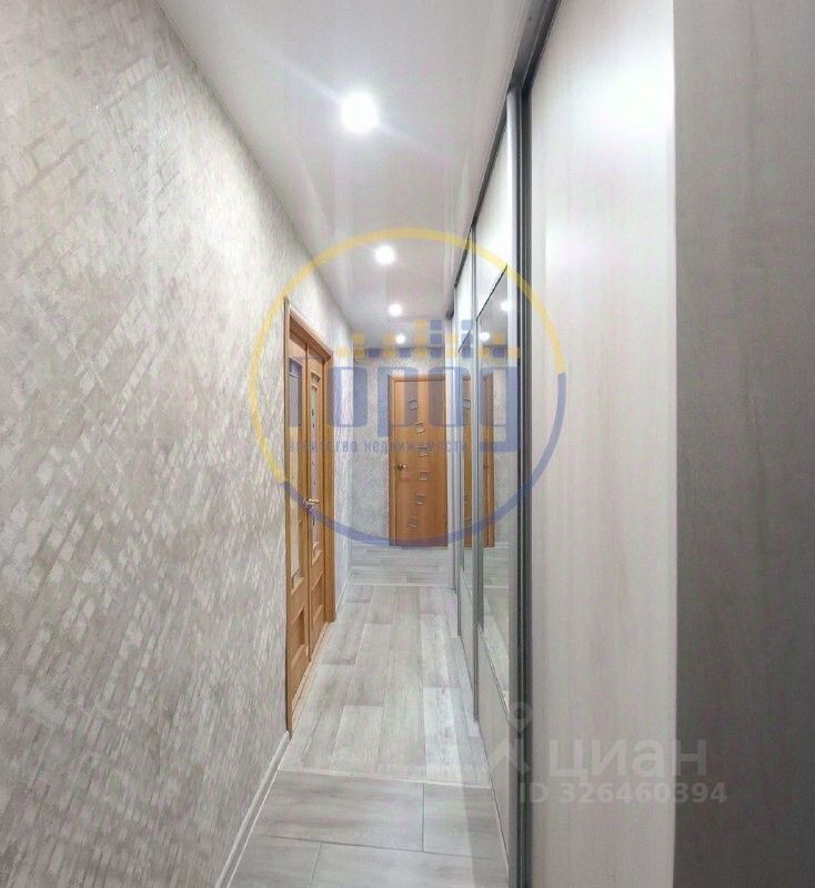 В прихожей установлен вместительный и функциональный встроенный шкаф-купе. Натяжные потолки. На полу - ламинат, в прихожей - плитка.