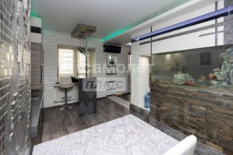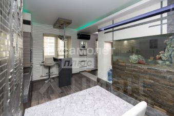 Кухня отделена от гостиной декоративной стеной со встроенным большим аквариумом оригинальное дизайнерское решение, которое визуально зонирует пространство и создаёт уют