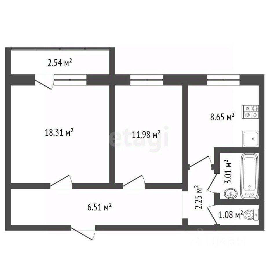 Планировка: кухня-гостиная, 2 спальни, раздельный санузел, прихожая.