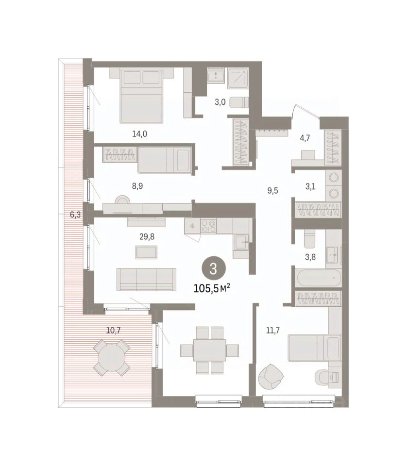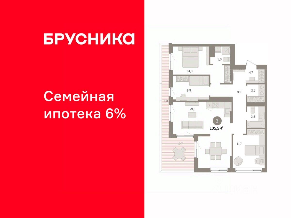 Квартира с кухней-гостиной и тремя спальнями в Брусника в Эльтауне. Особенности планировки: вид во двор, второй санузел, мастер-спальня, постирочная, разнесённые спальни, терраса на крыше.