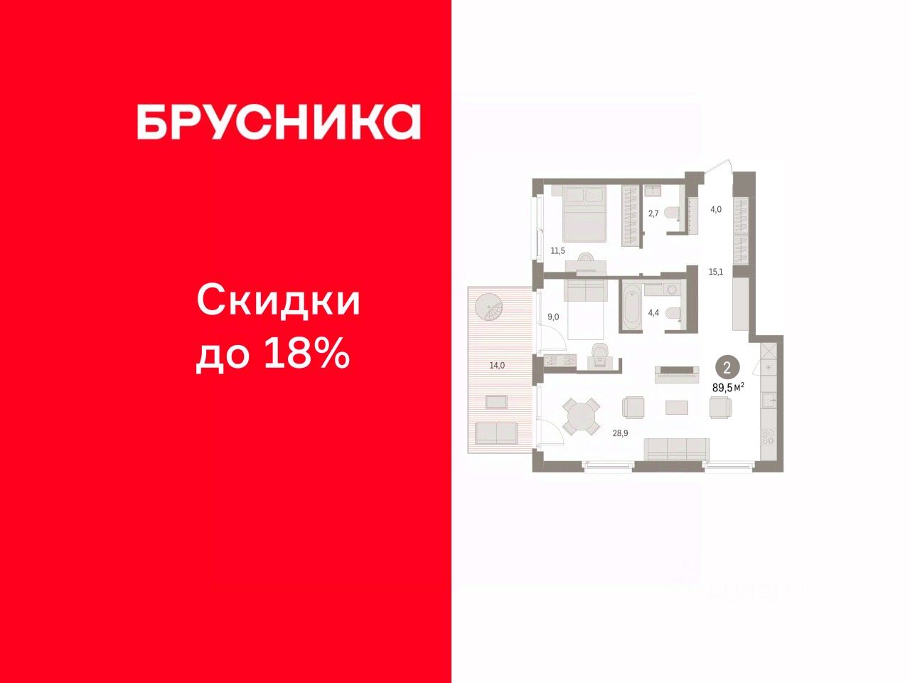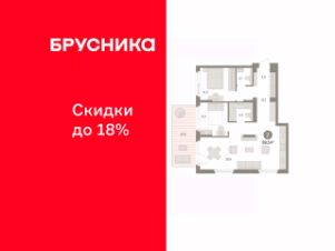 Квартира с кухней-гостиной и двумя спальнями в Брусника в Эльтауне. Особенности планировки: вид во двор, второй санузел, новые лоты, окна в пол, панорамное остекление, потолки 3 м и выше, разнесённые спальни, терраса.