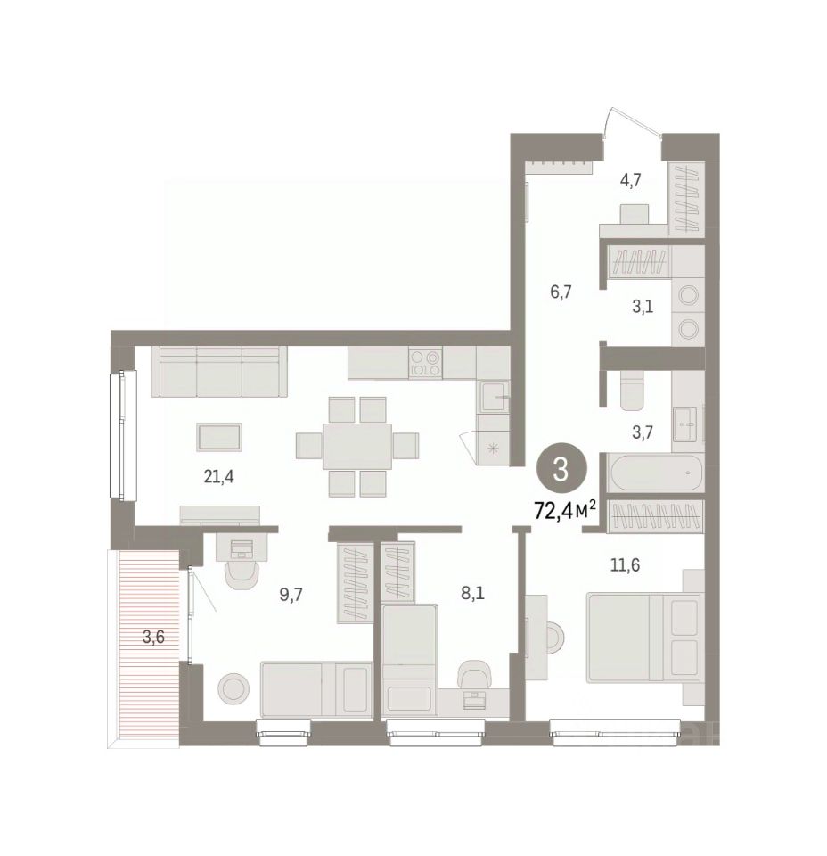 Трехкомнатная квартира с предчистовой отделкой в ЖК "Брусника в Эльтауне" на 4 этаже. Общая площадь: 72.4 кв.м. Высота потолков 2.7 м.