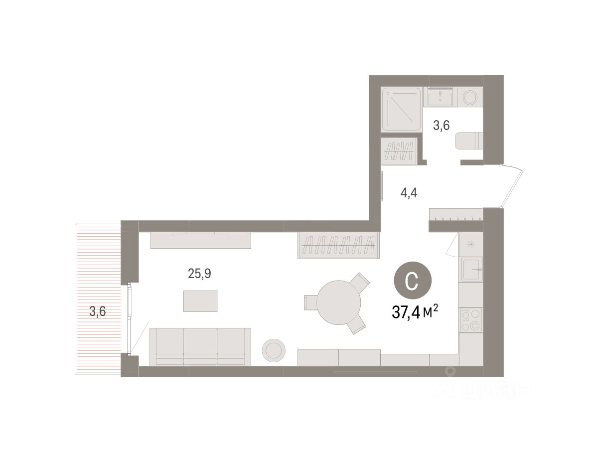 Студия в Брусника в Эльтауне. Особенности планировки: балкон.