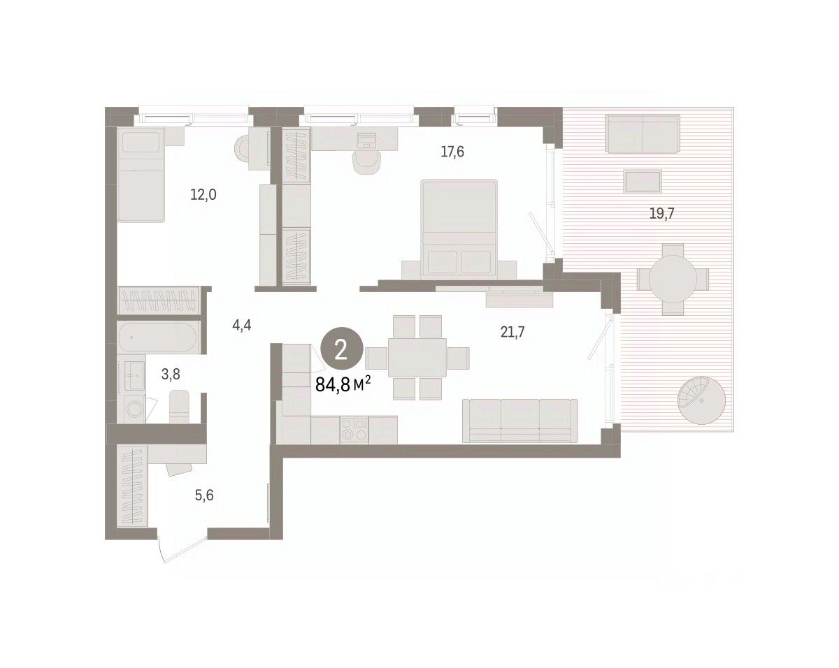 2-комн. квартира от застройщика с предчистовой отделкой в ЖК "Брусника в Эльтауне" на 1 этаже. Общая площадь: 84.77 кв.м. Высота потолков 2.7 м.