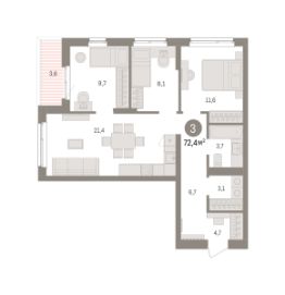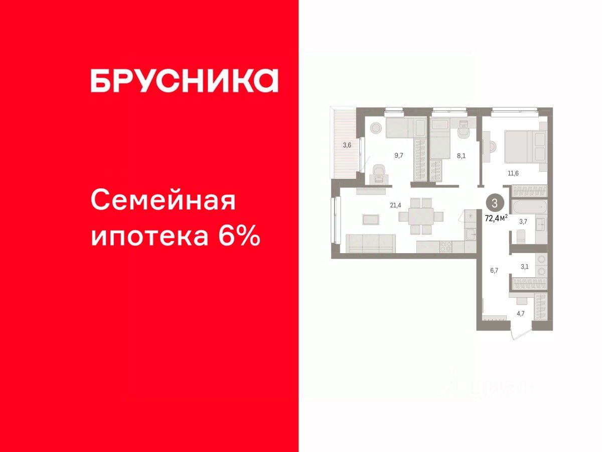 Просторная 3-комн. квартира с предчистовой отделкой в ЖК "Брусника в Эльтауне" на 4 этаже. Общая площадь: 72.4 кв.м. Высота потолков 2.7 м.