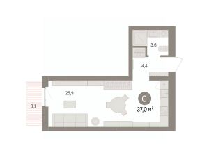 Однокомнатная студия с предчистовой отделкой в ЖК "Брусника в Эльтауне" на 5 этаже. Общая площадь: 36.98 кв.м. Высота потолков 2.7 м.