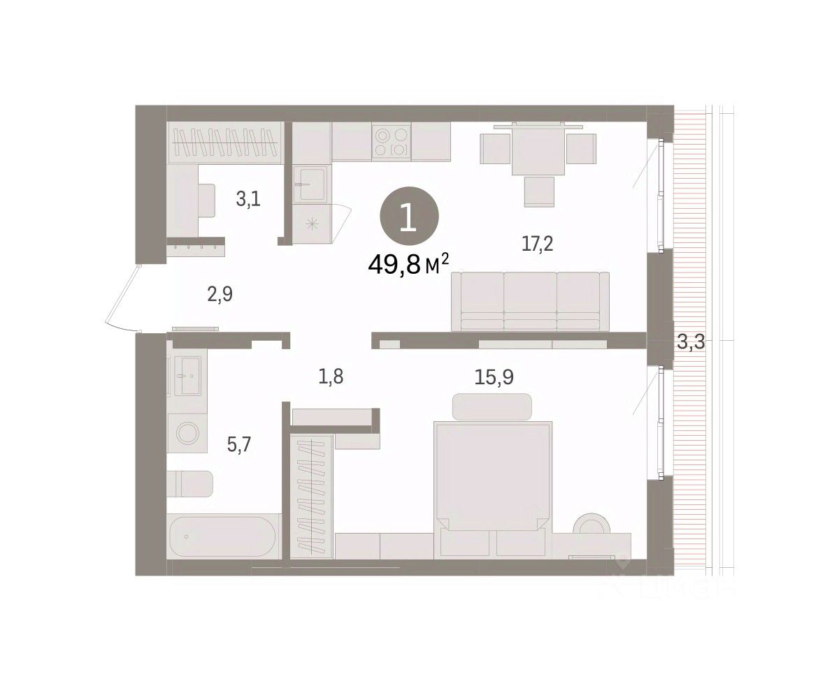 1-комн. квартира с предчистовой отделкой в ЖК "Брусника в Эльтауне" на 6 этаже. Общая площадь: 49.77 кв.м. Высота потолков 2.7 м.