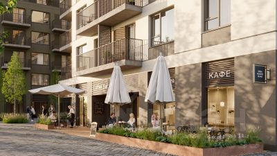 Территория Брусники разделена на несколько функциональных зон. Со стороны улицы Павленкова мы спроектировали фронт с коммерцией и приветственными площадями. На первых этажах домов — кафе, магазины, рестораны, кружки и образовательные студии.