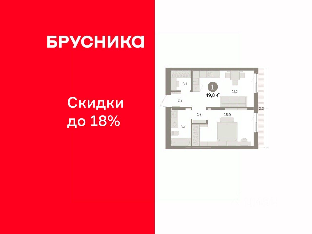 Квартира с кухней-гостиной и одной спальней в Брусника в Эльтауне. Особенности планировки: гардеробная, новые лоты, терраса на крыше.