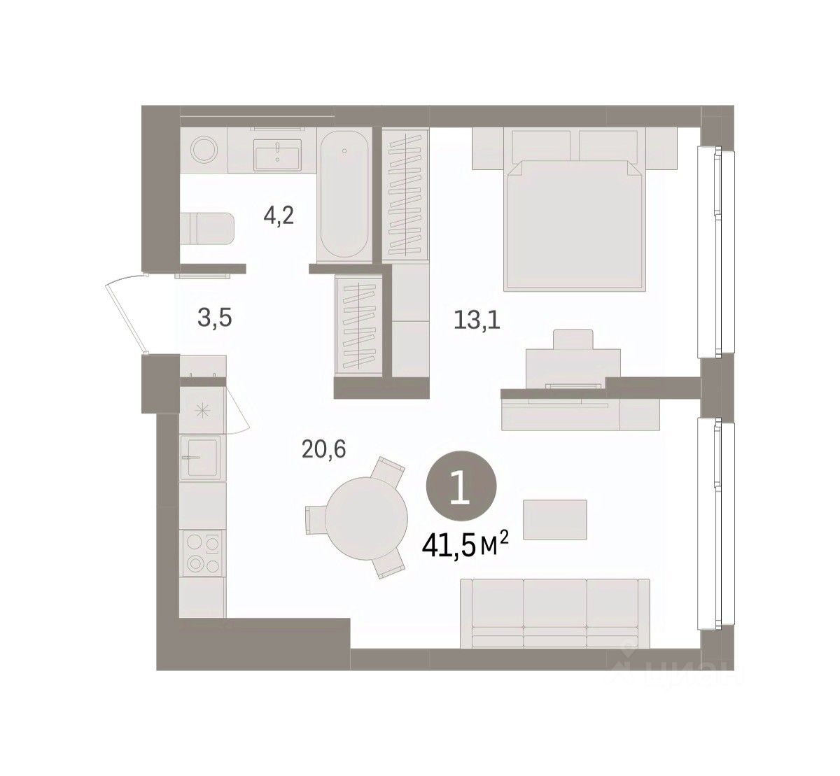 Квартира с кухней-гостиной и одной спальней в Брусника в Эльтауне. Особенности планировки: вид во двор.