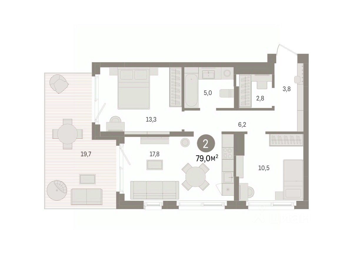 Квартира с кухней-гостиной и двумя спальнями в Брусника в Эльтауне. Особенности планировки: вид во двор, гардеробная, окна в пол, панорамное остекление, разнесённые спальни, терраса.