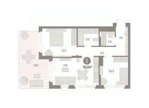 Двухкомнатная квартира от застройщика с предчистовой отделкой в ЖК "Брусника в Эльтауне" на 1 этаже. Общая площадь: 78.96 кв.м. Высота потолков 2.7 м.