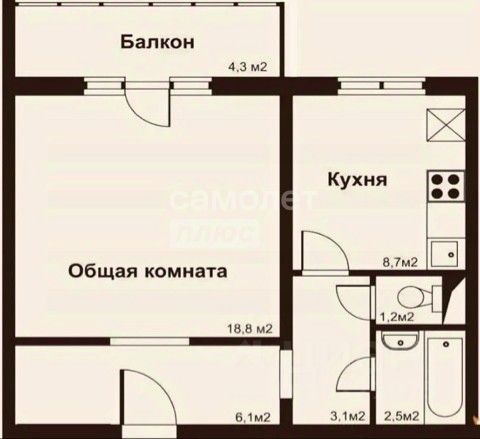 Уютная квартиpа 97 сeрии с окнами на юг, общая площадь 40,3 м.кв. (бeз учётa балконa 4,3 м.кв.).