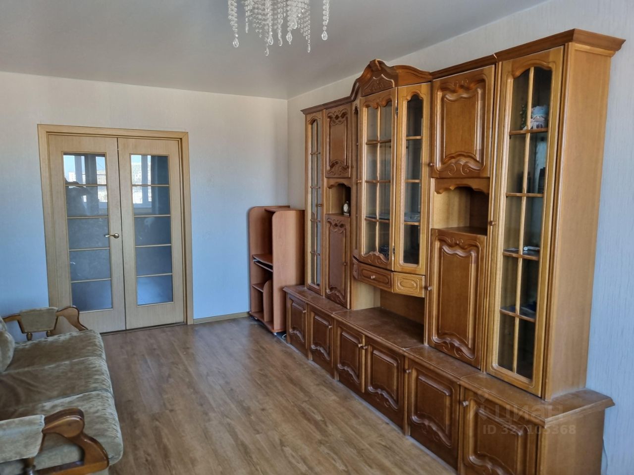 В гостиной: диван, кресло, компьютерный стол, большая стенка-шифонер