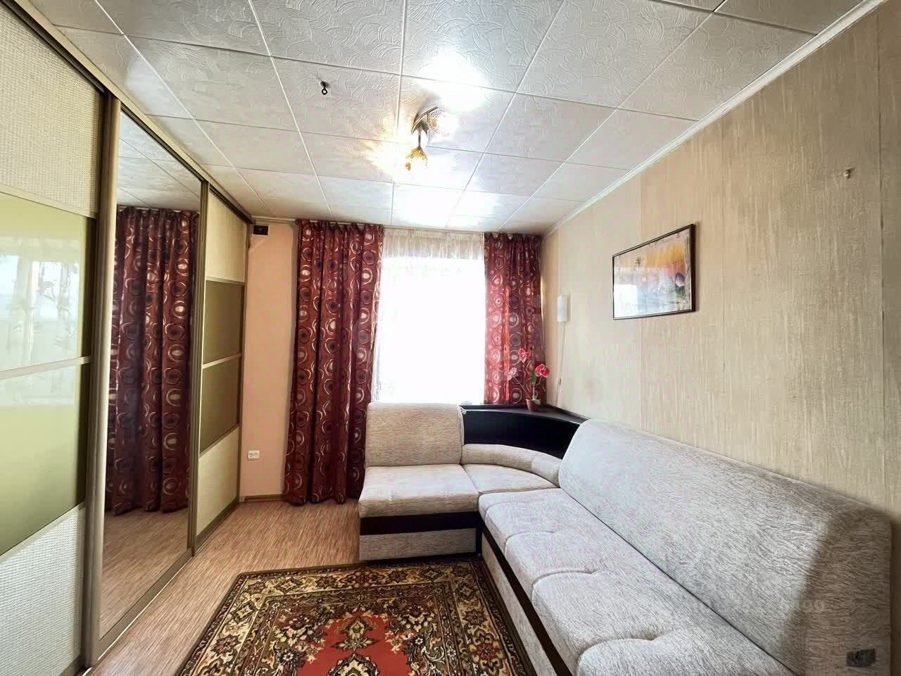 В квартире сделан косметический ремонт: стены, обои, пол - линолиум, сан узел - кафель , потолок - потолочная плитка.