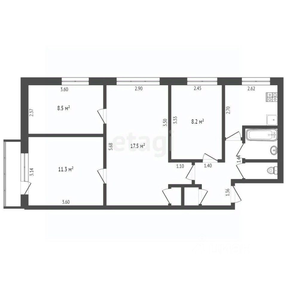 3-разделенные спальни ( 8,5м2, 11, 3м2 и 8,2м2 ), 1 комната проходная (17,5м2 ), кухня 6м2. С\У разделений, коридор просторный. В квартире при продаже частично остаётся мебель. Очень тёплая и светлая квартира. Дом кирпичный. Соседи дружелюбные, все друг друга знают.