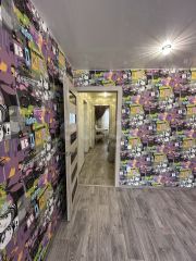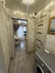 В квартире выполнен качественный ремонт с полной заменой инженерных систем: обновлена электропроводка, трубы водоснабжения и канализации, установлены современные радиаторы отопления. Ванная комната отделана кафелем. Установлены пластиковые окна, натяжные потолки, новые межкомнатные и металлическая входная двери, покрытие пола — линолеум.