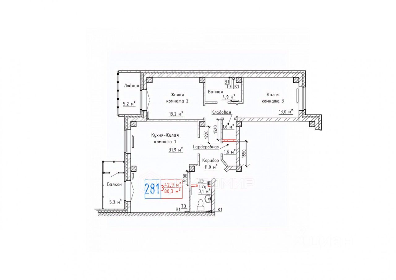 Общая площадь 80,3 м2