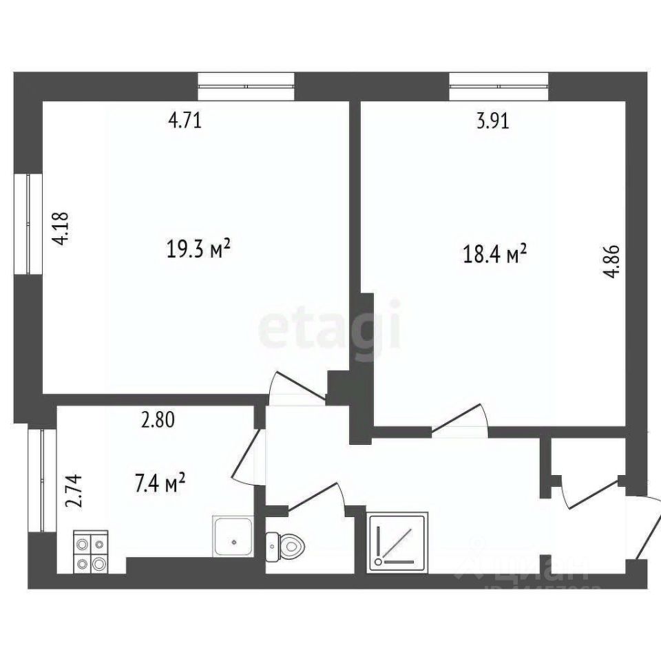 Просторные раздельные комнаты площадью 18,4 и 19,3 кв.м., требуется лишь небольшой косметический ремонт.