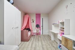 Спальни: уютные комнаты со встроенной мебелью, в одной из них — парящая кровать с подсветкой.