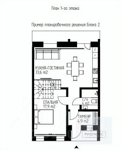 Первый этаж: включает в себя: гааж (24 кв.м.)тамбур ( 6,3 кв.м.), совмещенный санузел ( 4,3кв.м.),и огромная кухня-гостиная ( 41,2 кв.м.)с витражным окном и выходом на участок (при необходимости можно разделить кухню и гостиную)