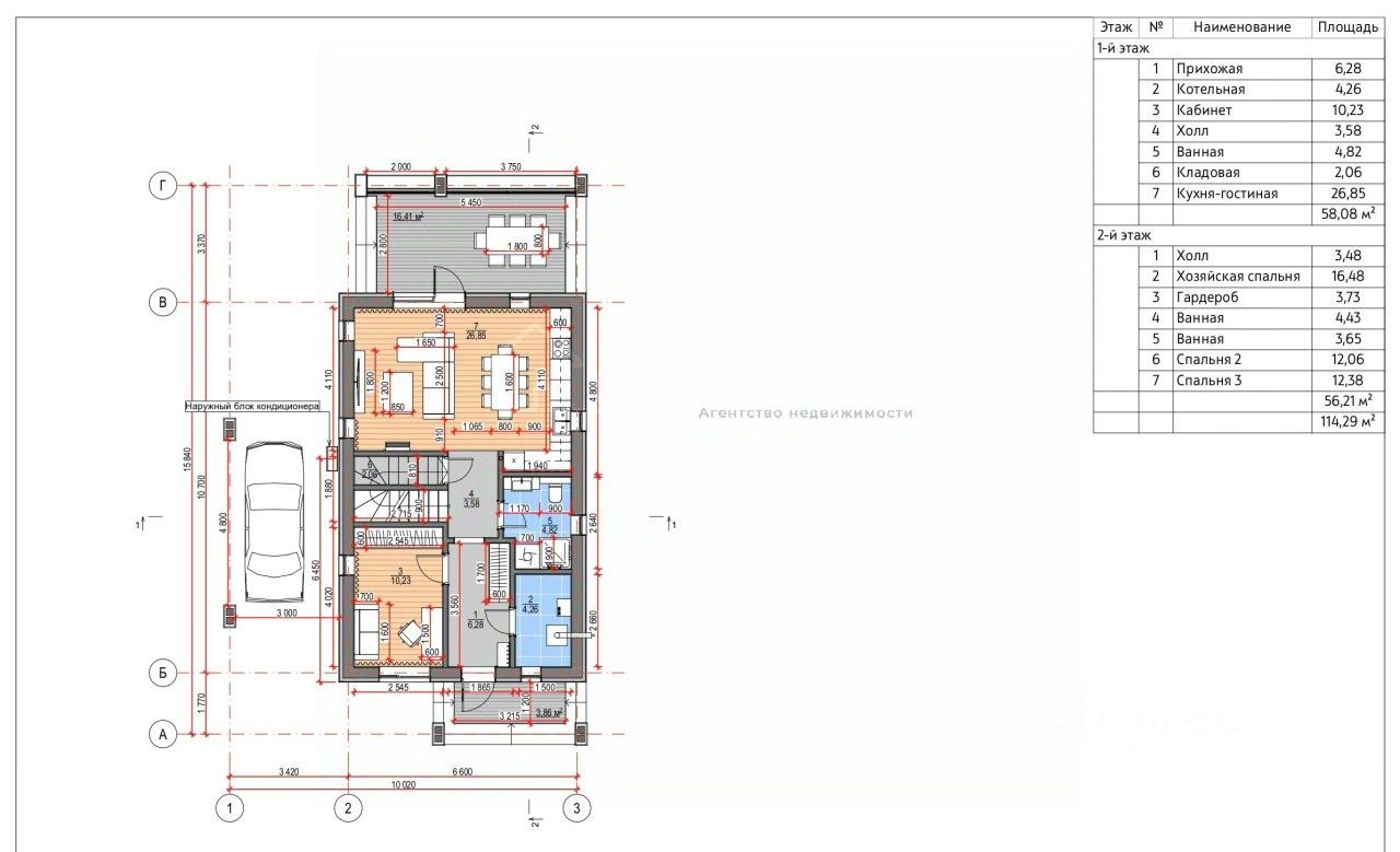 - жилая площадь 1 и 2 этаж - 114,3